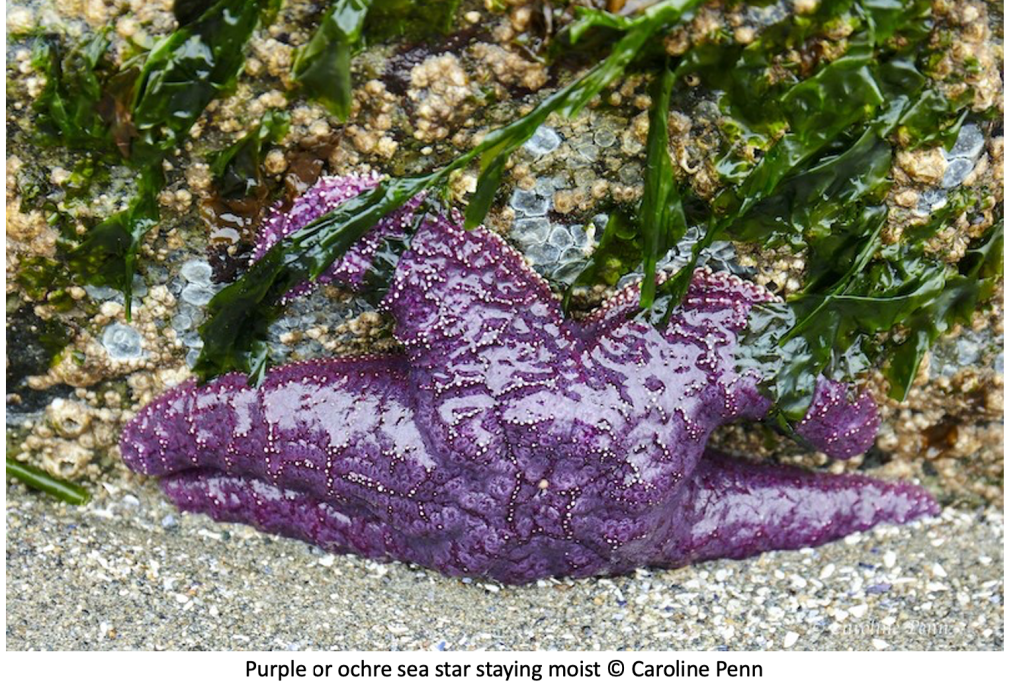 An important news report is that a good number of purple or ochre sea stars (Pisaster ochraceous) continue to be found hunkered down under the north-facing base of many of the large boulders. A few unhealthy-looking individuals were found ‘out in the open’. Was this a sign that the sea star wasting disease syndrome was still present; or did these few individuals succumb to the persistent pecking of the hungry sea gulls and crows? Considering the health of the majority of the purple stars it was likely the latter. Healthy looking leather stars and mottled stars were also found, evidence of a promising recovery of these species of sea stars. However, the survival and recovery of the affected sunflower star (Pycnopodia helianthoides) remains uncertain.
