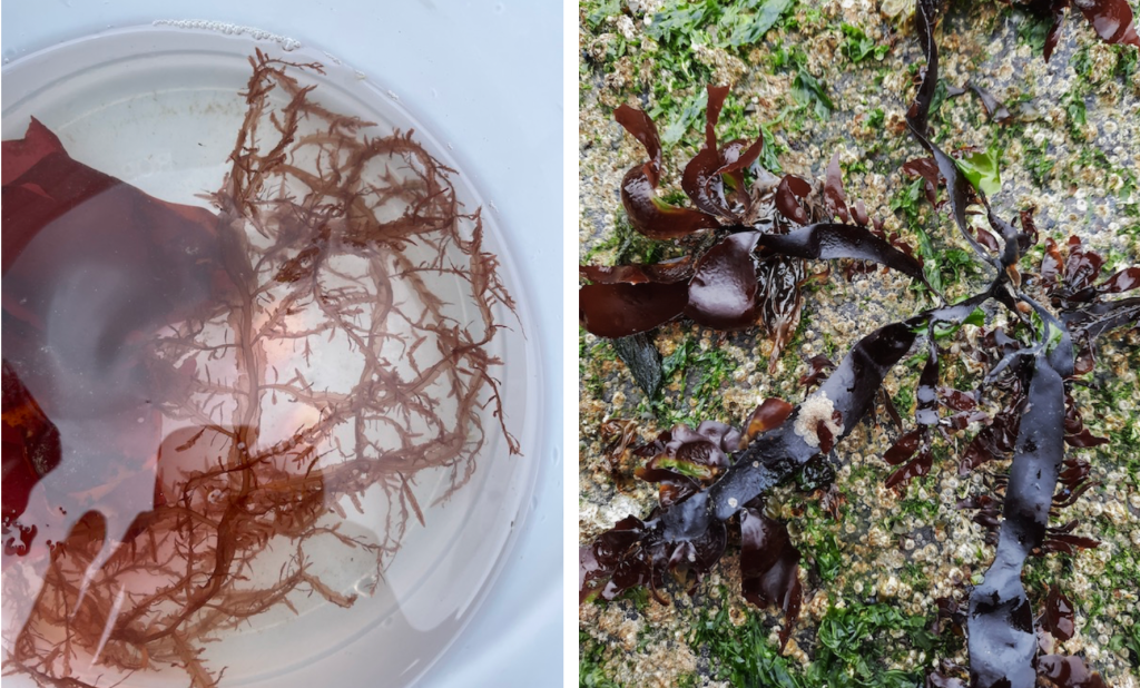 A large specimen of Turkish towel (Chondracanthus exasperatus) provided an example of red seaweed. Red seaweed contains the phycoerythrin pigment but seaweed colour can vary from deep wine reds to purplish pink. Dark red variations, in particular, can present difficulties distinguishing dark brown seaweed. Note the bumpy surface (papillae) of the towel that gives the seaweed its rough texture and human interest to use this ‘towel’ as a handy skin scrub.
