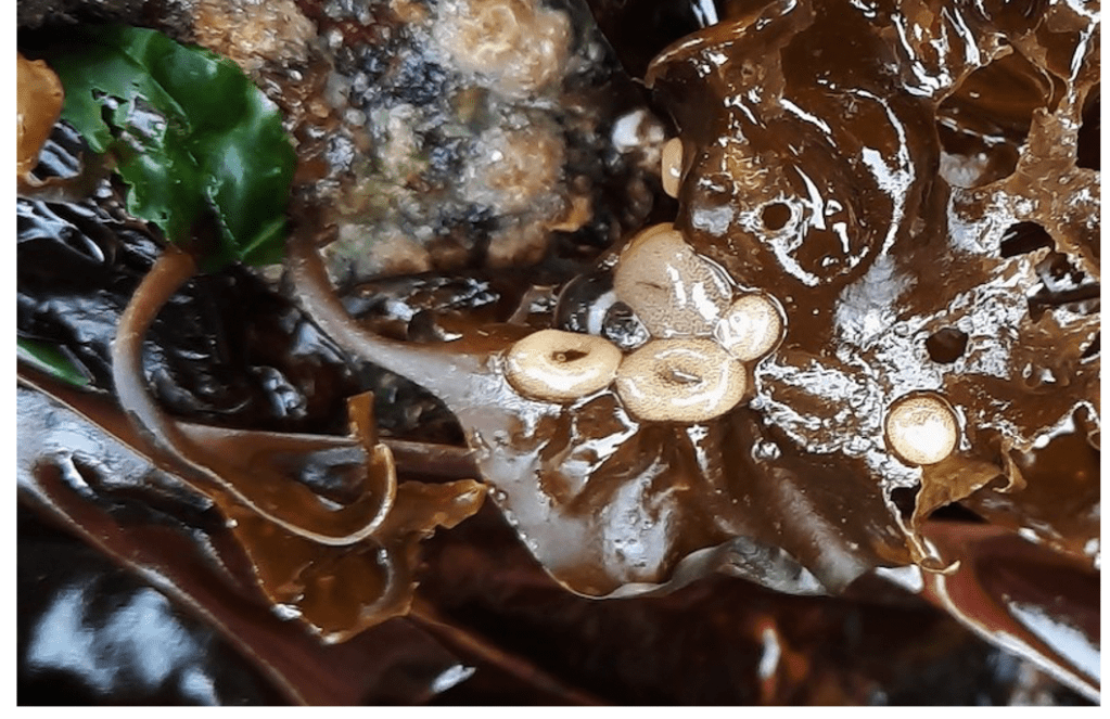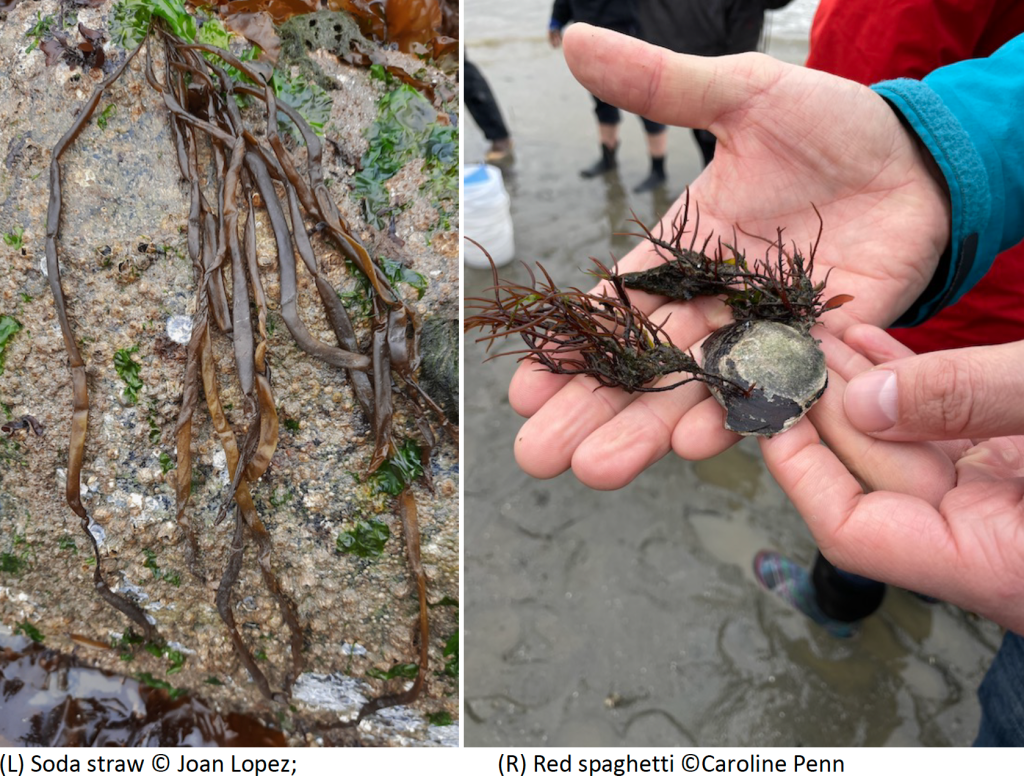 A much smaller brown seaweed looked like well-used paper straws: unbranched hollow tubes that had constrictions at more-or-less regular intervals. This golden-brown seaweed is known as the soda straw (Scytosiphon lomentaria). The soda straw is a strong contrast to the multi-branching red seaweed attached to the shell. The latter red spaghetti seaweed is a Gracilaria species that is part of a complex of difficult species to identify. As Druehl and Clarkston state of Gracilaria in their 2016 book, the complex of species appears to be distinguished by a lack of distinguishing features – at least, none that are morphological(describing the form of living organisms). So much to learn!!